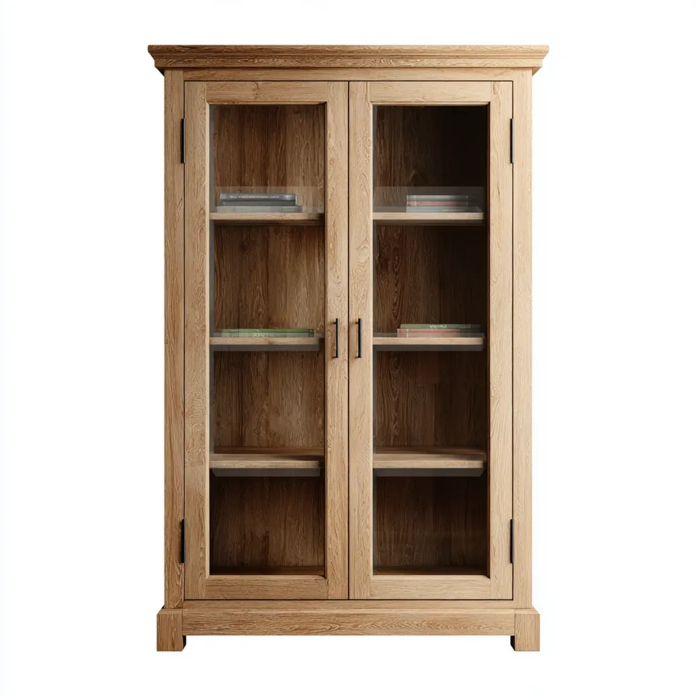 Cette armoire est construite en chêne massif, offrant robustesse et longévité. Sa finition en bois naturel et ses portes vitrées donnent un look intemporel.